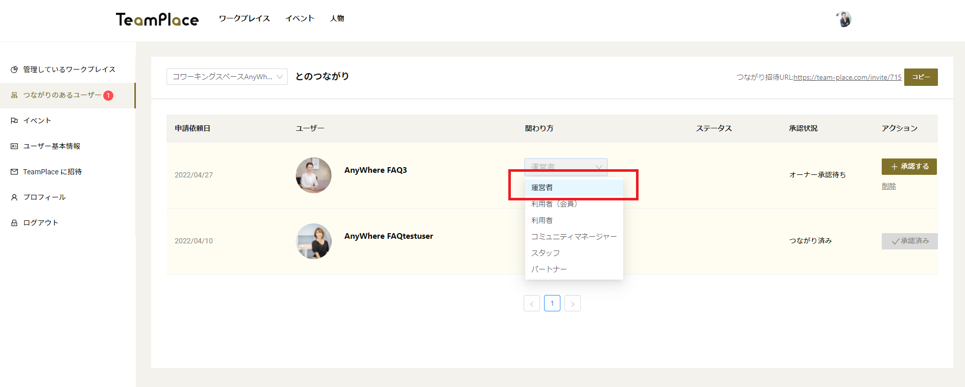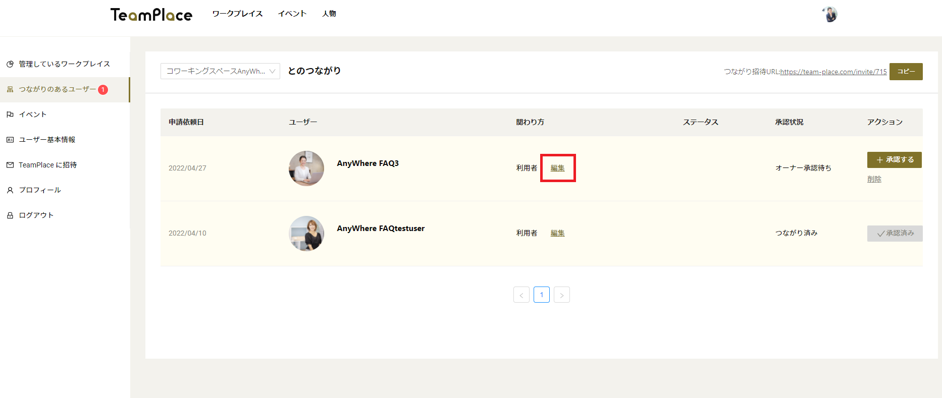 ▼つながり招待URLでTeamPlaceにユーザーを招待したい