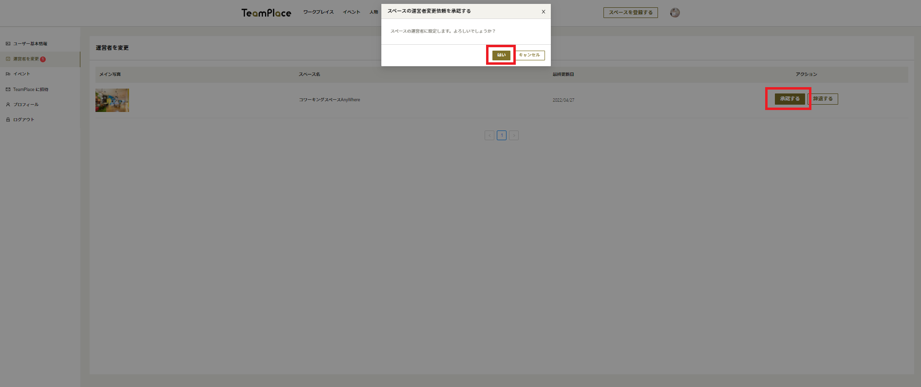 3.TeamPlaceが立ち上がったらアクションの項目の「承認する」をクリック