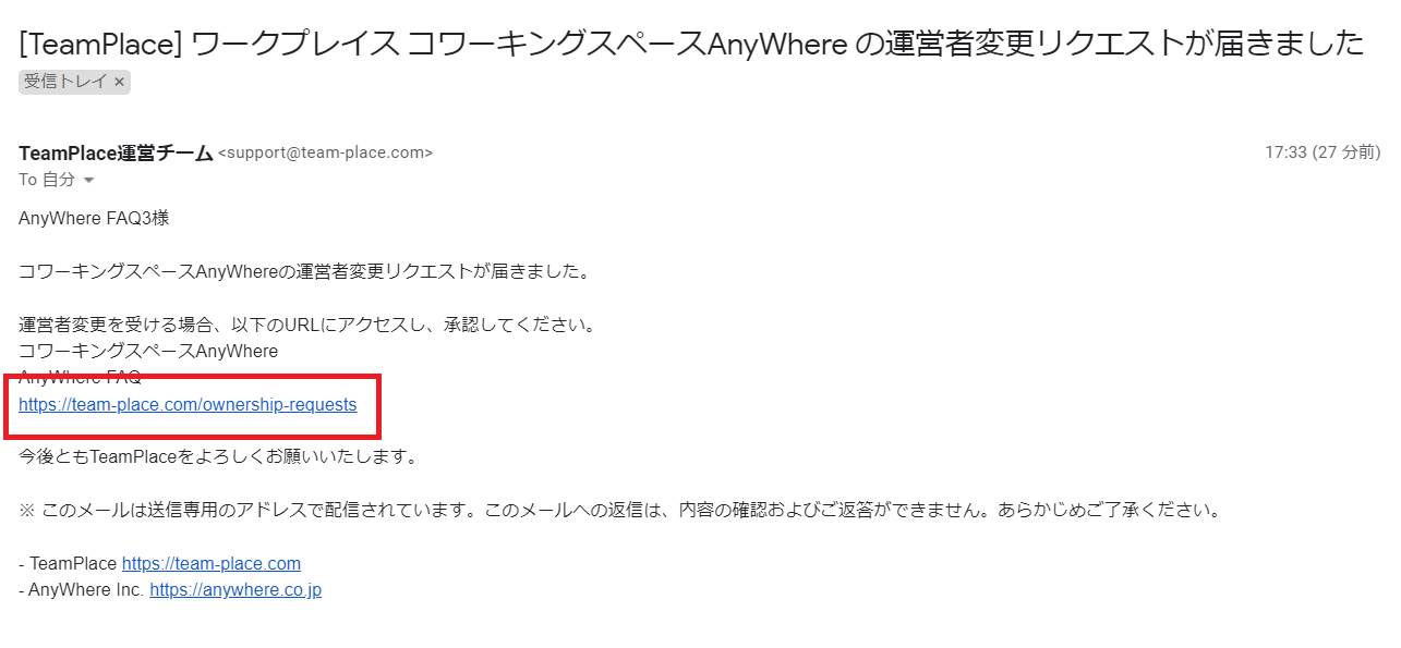 1.現在の運営者が運営者変更を行うと、新しい運営者のメールアドレス宛に以下のメールが送信されるので、メールを開く