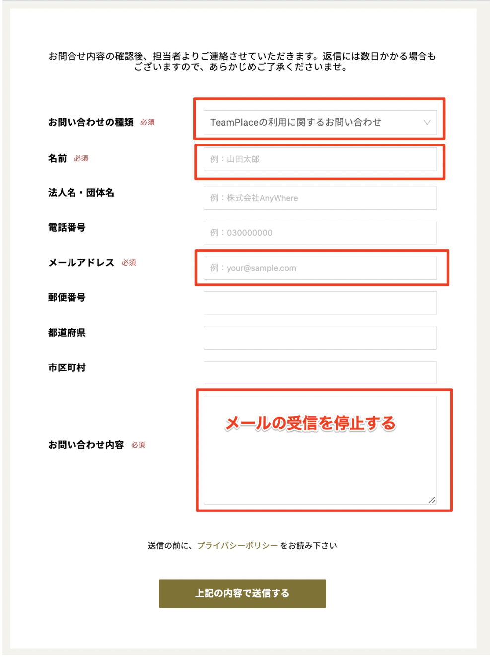 4.お問い合わせ内容:「メールの受信を停止する」と入力