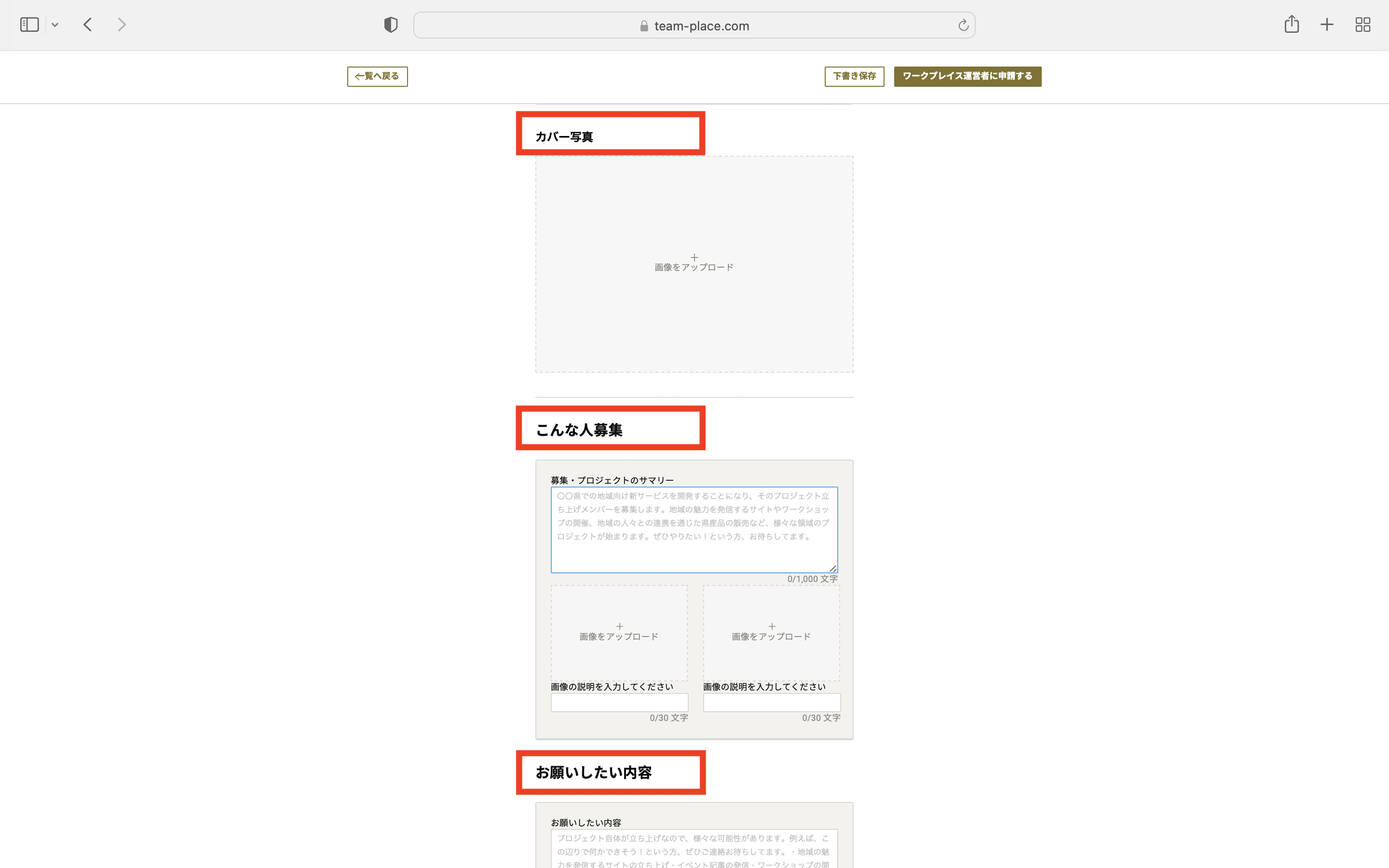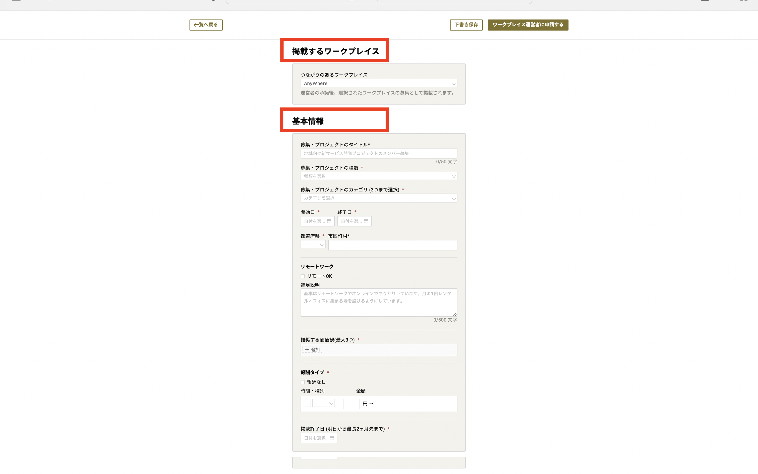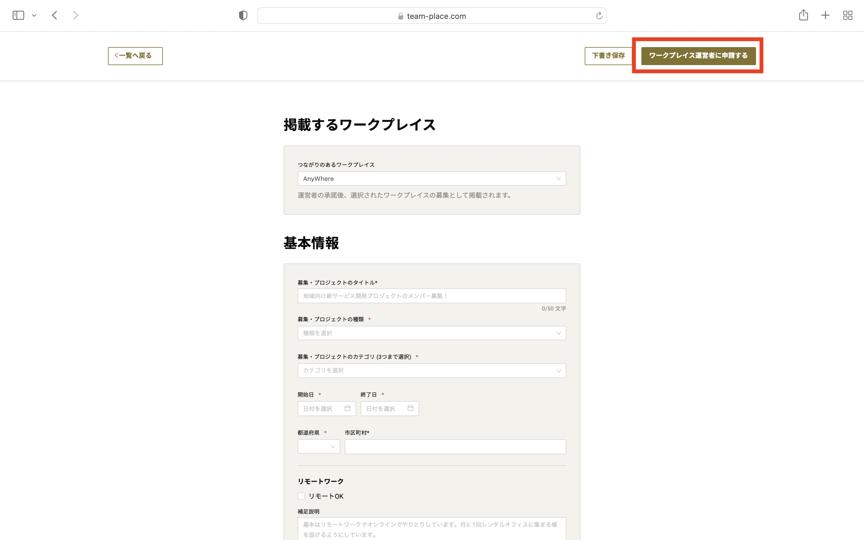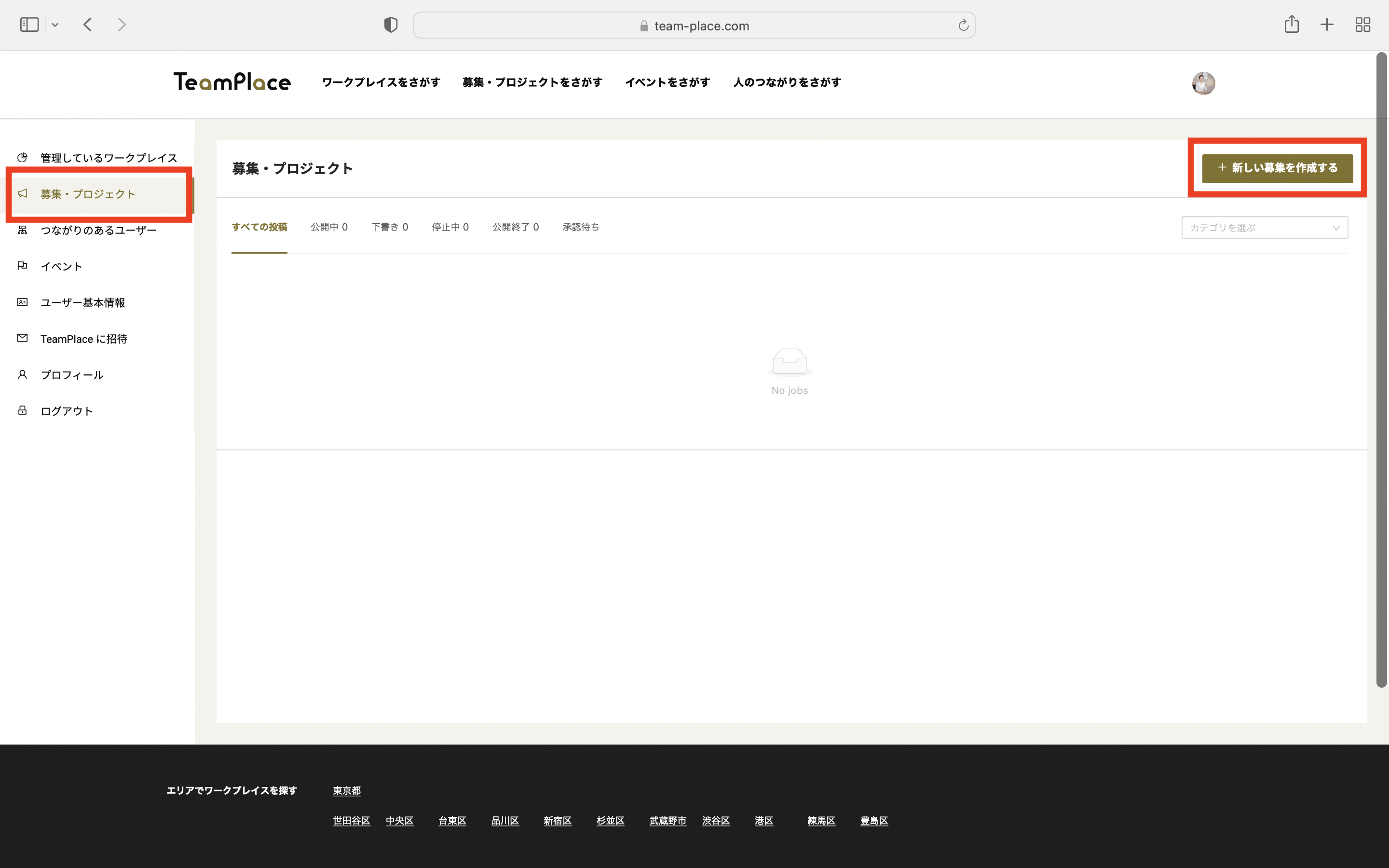 ※募集ページは、つながりのあるワークプレイスに紐づけて作成されます。公開されているつながりのあるワークプレイスがない場合、作成できませんのでご注意ください。