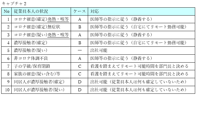 想定しうるケース毎の対応を下記キャプチャ2のとおり設定しています。該当する場合は部門長および人事本部に相談し、勤務方法について指示を仰いでください。
