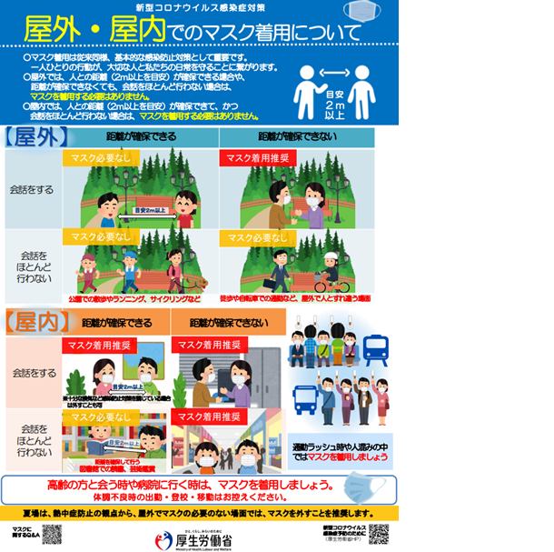 【屋内】会話がないときはマスク不要です。会話する時や混み合う電車内などは着用ください。