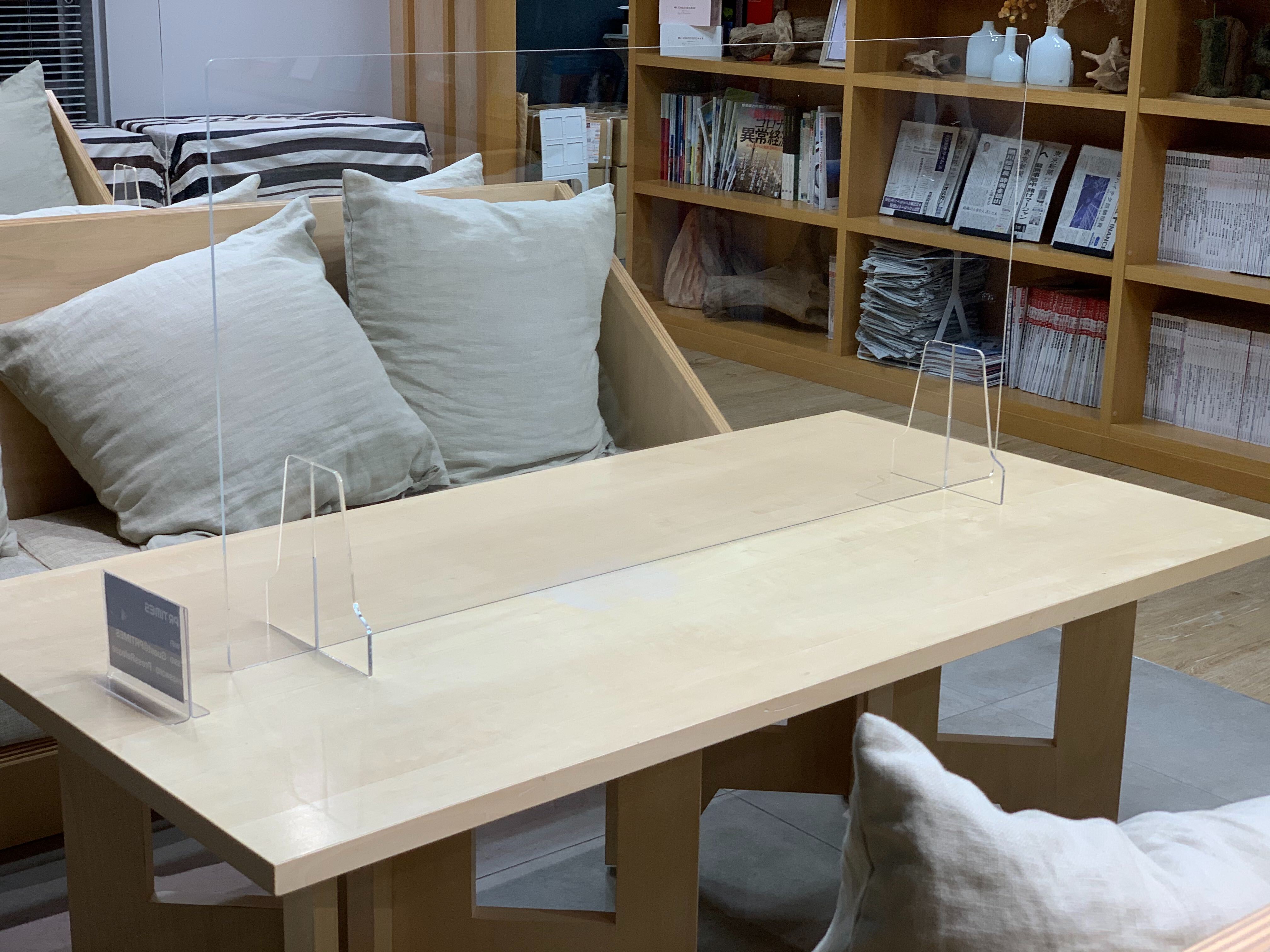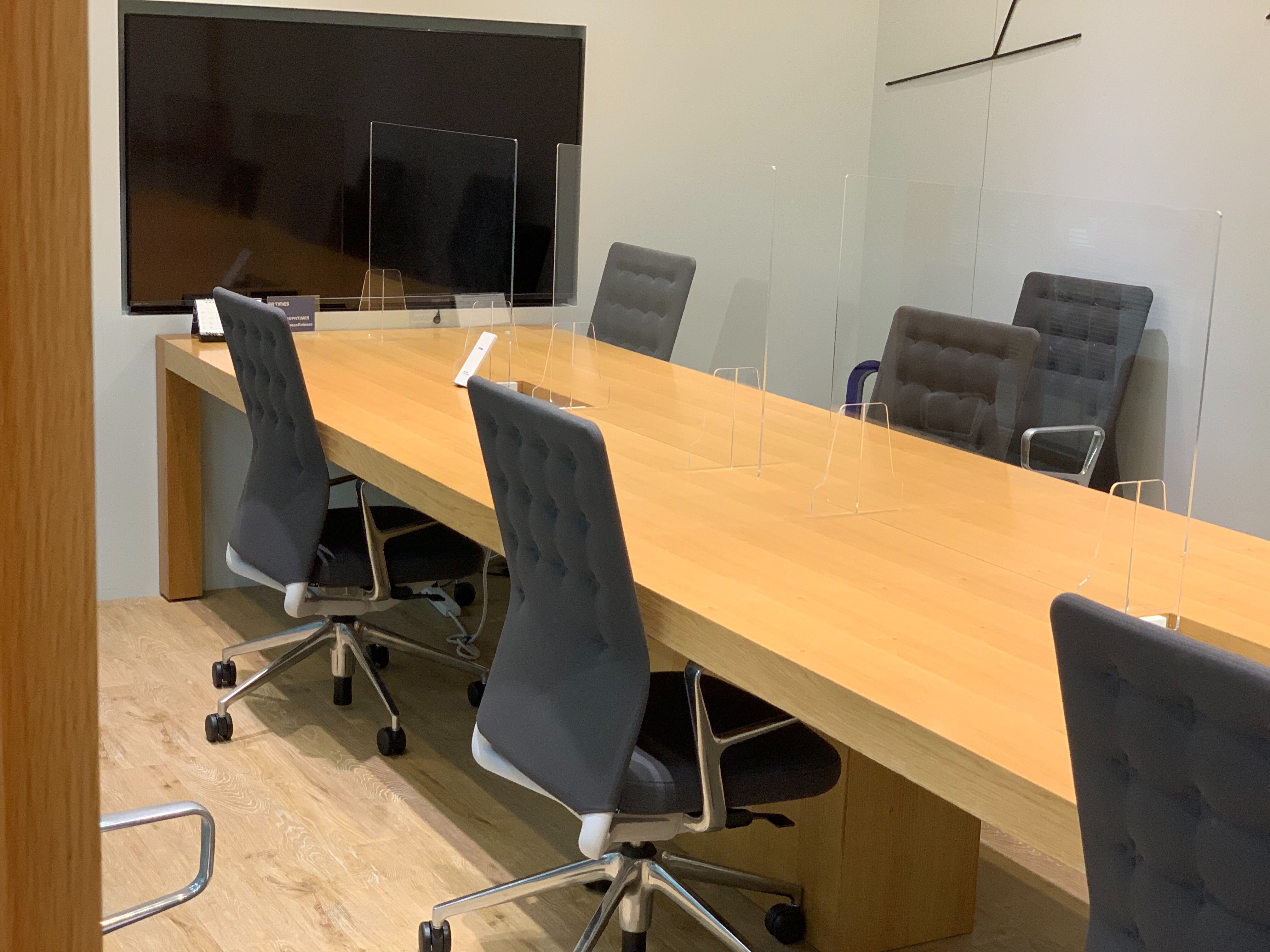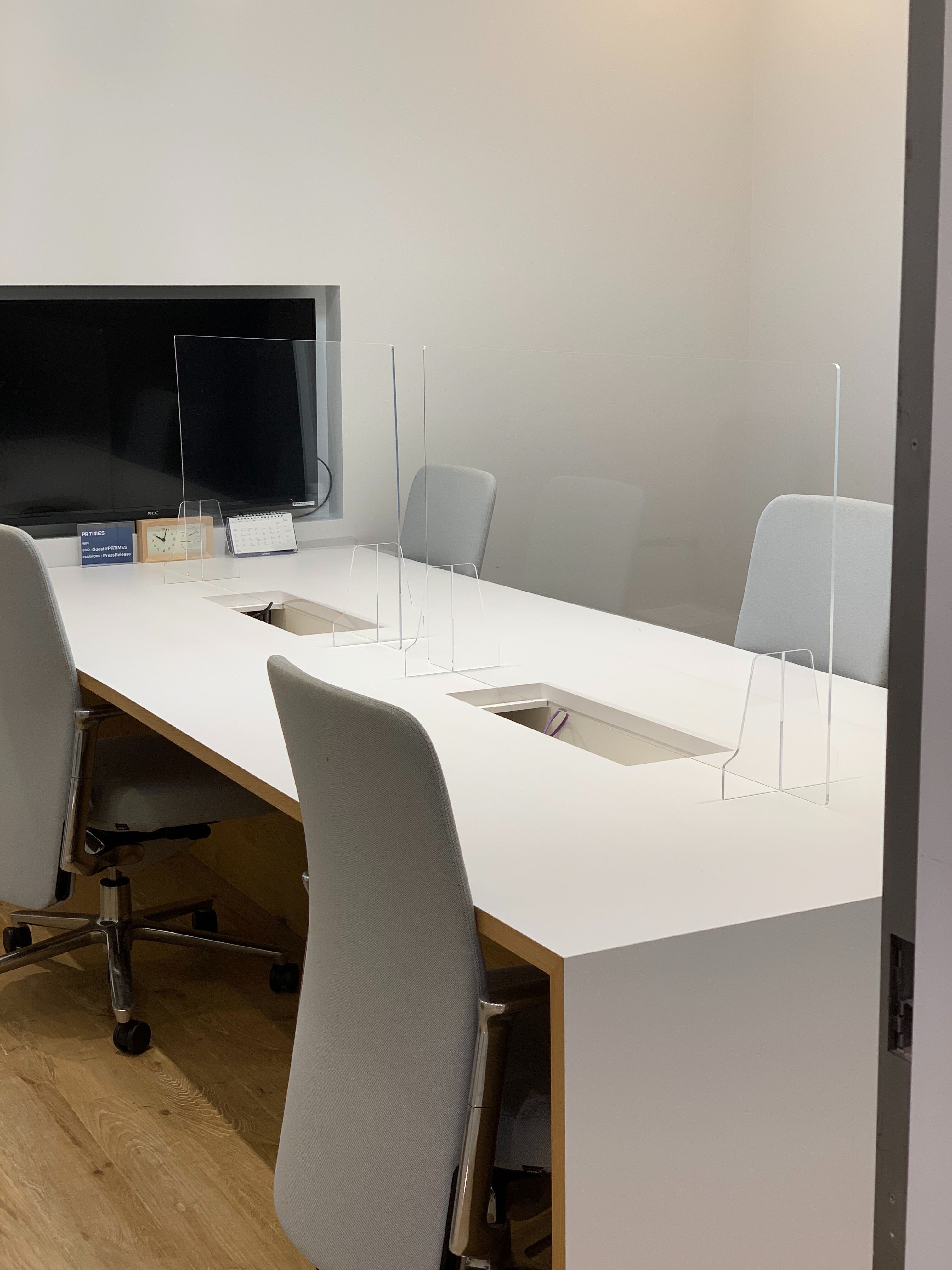 会議室、要出社で電話応対等の多い席、飲食を伴う場に、優先的にアクリルパネルを設置。椅子は間引いています。
