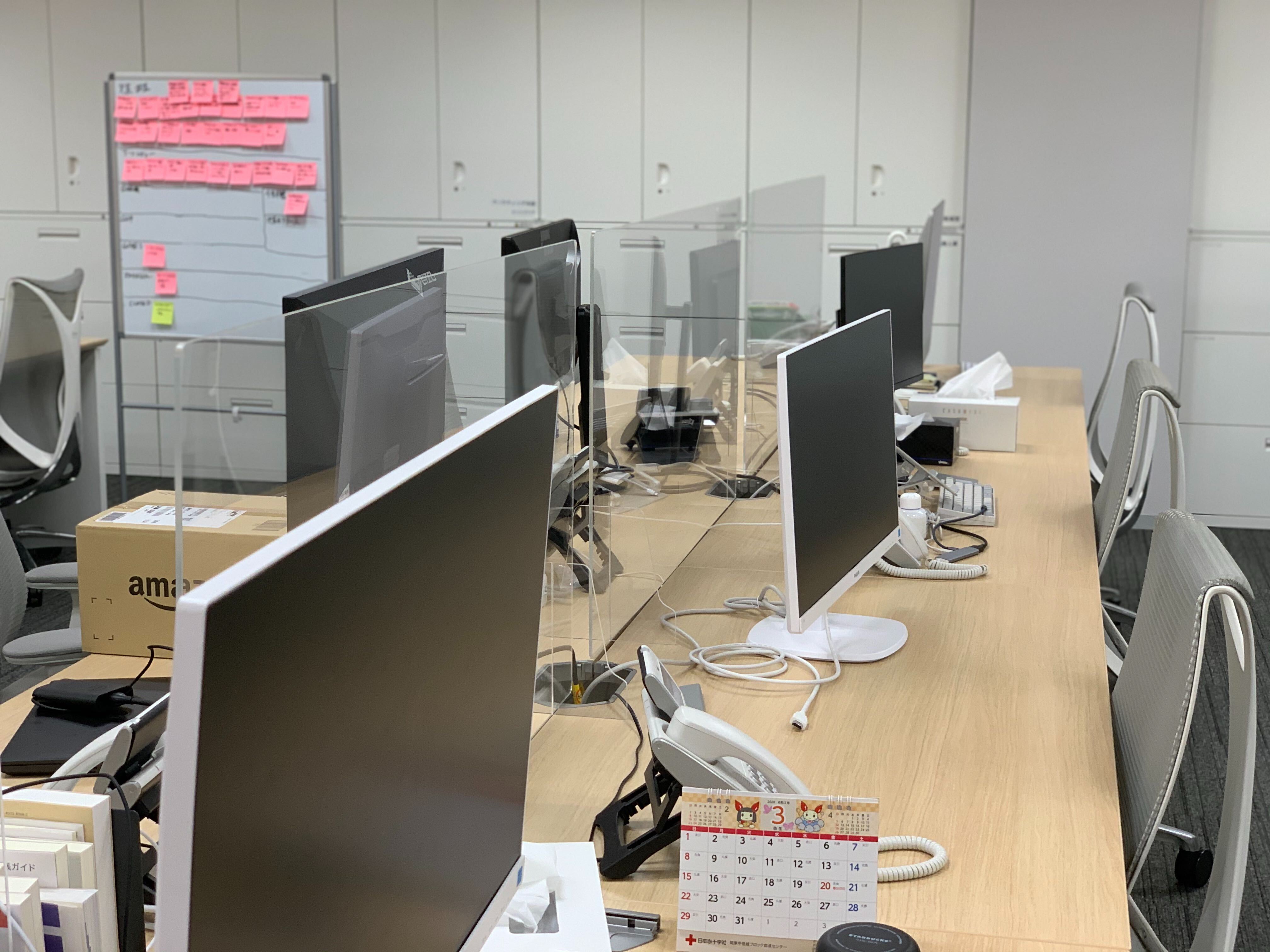 これから段階的に出社人数が増えますので、飛沫防止とソーシャルディスタンス確保にご協力宜しくお願いします。