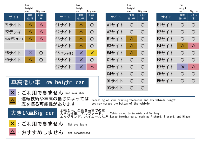 - 当キャンプ場では全幅2m、全長5mまでの車を【大きい車】と定義しています。大きな外車、アルファード、 エルグランド、ハイエースなど