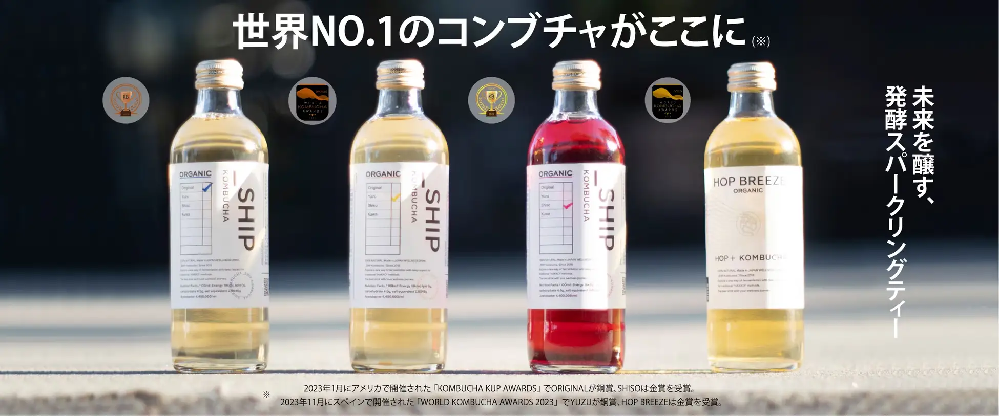 KOMBUCHA KUP AWARDS オリジナル部門3位の「ORIGINAL」、ハーブ部門1位の「SHISO」、 WORLD KOMBUCHA AWARDS 2023 シングルフルーツ部門3位の「YUZU」、ホップ部門1位の「HOP BREEZE」の4つのフレーバーを展開しています。