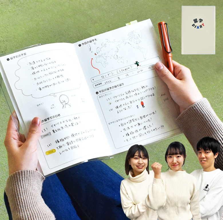 留学前~留学後まで留学生のために開発された手帳。留学前ページ:やる事、持ち物リスト。友人からの応援メッセージ・目標ページ 留学中ページ:週間スケジュールと出来事日記。覚えた言語の学習ページ 留学後:留学を振り返るページ等
