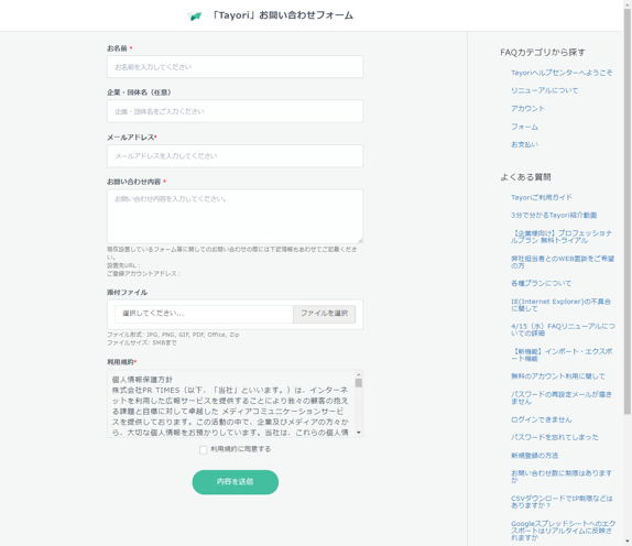Tayoriのコンタクトフォームの特徴の1つは、FAQコンテンツを一緒に表示できること。コンタクトフォームの右側か左側にFAQを一覧表示して、問い合わせする前にFAQで疑問・不満を解消できないか、確認を促すことができます。
